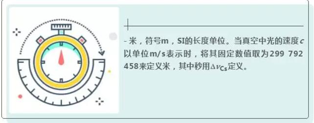 - 米,符號m,SI的長度單位。當(dāng)真空中光的速度c以單位m/s表示時,將其固定數(shù)值取為299 792 458來定義米,其中秒用DnCs定義。