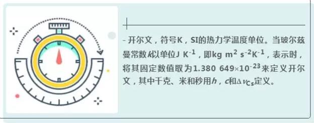 - 開爾文,符號K,SI的熱力學(xué)溫度單位。當(dāng)玻爾茲曼常數(shù)k以單位J K-1,即kg m2 s-2K-1,表示時,將其固定數(shù)值取為1.380 649′10-23來定義開爾文,其中千克、米和秒用h,c和DnCs定義。