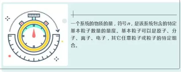 一個系統(tǒng)的物質(zhì)的量,符號n,是該系統(tǒng)包含的特定基本粒子數(shù)量的量度。基本粒子可以是原子、分子、離子、電子,其它任意粒子或粒子的特定組合。